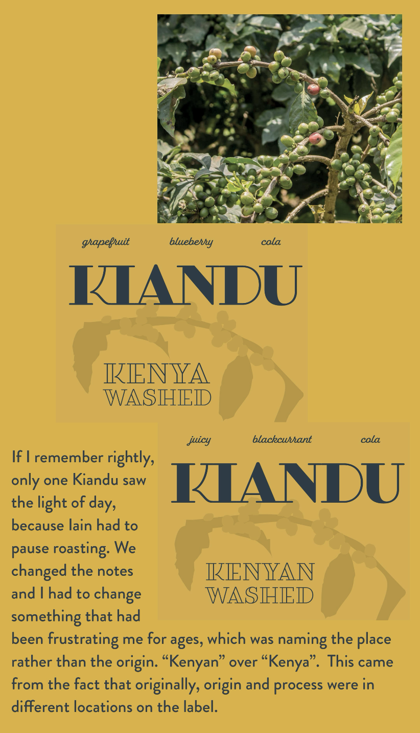 The back labels of the coffees evolved over time, too. At first we thought the size of the label was limited by the position of the valve on the bags, so we needed something small. Only the key info could fit. This included something about the distinction between "Natural" and "Washed" coffees, the two main coffee processing methods.